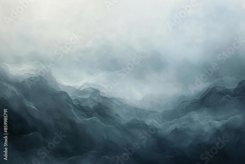 Design a photorealistic painting depicting intricate layers of abstract fog shapes viewed from above, capturing a serene and enigmatic atmosphere,