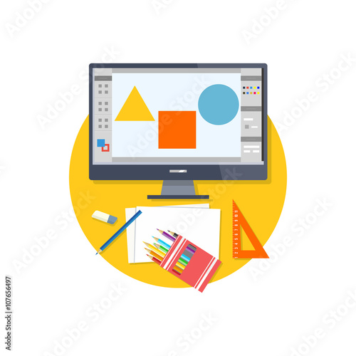 graphic, design, workplace, technology, web design, graphic elements, web, business, idea, computer, drawing, digital, studio, tool, work, crayons, monitor, paint, object, equipment, tablet, project, ruler, frame, element, icon, vector, illustration, colours, creative, concept, art, background, symbol, abstract, modern, signs, flat, template, creativity, isolated, shape, style, bright, white, group