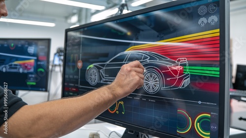 Designing a High-Performance Sports Car with Advanced 3D Technology. A hand interacts with a digital rendering of a futuristic race car design on a computer monitor.