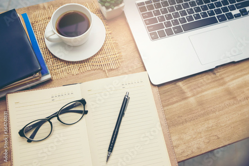 Desk for student concept. Laptop Computer for study for exam, book place on School table for student work online at home. Desktop laptop, notebook, book cup of coffee place on wooden desk.