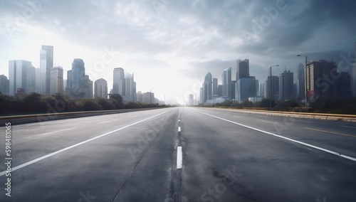 empty, asphalt, road, modern, city landscape, horizon, urban, skyline, transportation, journey, travel, speed, fast, motion, drive, route, direction, street, highway, commute, commuting, infrastructure, construction, progress, development, futuristic, skyscraper, tall building, tower block, business district, downtown, metropolis, megacity, urbanisation, landscape, perspective, scenery, view, distance, destination, arrival, morning, sunrise, dawn, daytime, daylight, sunset, dusk