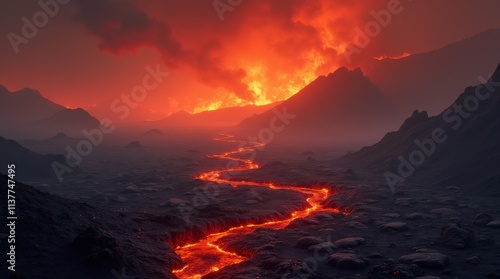 volcanic, wasteland, lava, river, molten, desolate, landscape, jagged, black, rock, mountain, fire, heat, destruction, nature, geology, environment, planet, earth, terrain, harsh, barren, surreal, dramatic, extreme, fiery, magma, crater, eruption, darkness, texture