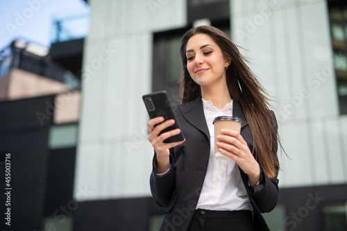 Detail of a business woman using her smartphone while drinking coffee