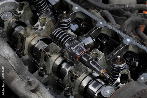 Detail of modern diesel engine repair, closeup of injectors in cylinder head with camshaft