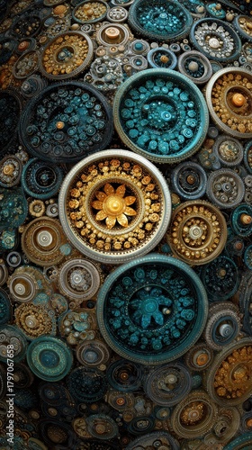 abstract, teal, gold, silver, circular, pattern, intricate, detail, geometric, complex, decorative, ornate, metallic, textured, artistic, design, contemporary, modern, creative, round, shape, element, unique, background
