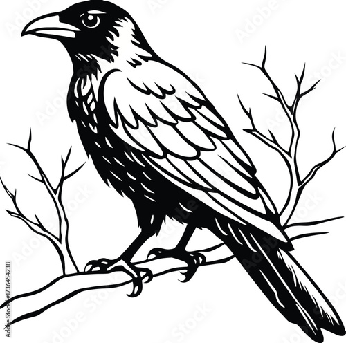 crow, bird, tree branch, black-and-white, drawing, illustration, animal, wildlife, nature, avian, perched, silhouette, vignetting, line art, graphic, design, vector, isolated, white background, monochrome, dark, feather, wing, beak, eye, forest, timberland, gothic, mysterious, symbolic, art, creative, minimalist, clean, simple, outline, icon, clip art, digital artwork, hand-drawn, vintage, retro, ornate, detailed, artistic, contemporary, graphic design, print, decoration