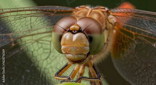 Detailed Brown Dragonfly Closeup with Translucent Wings on Green Background