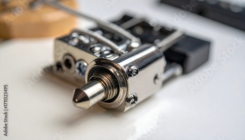 electric guitar, guitar, musical instrument, bridge, hardware, mechanism, closeup, detail, macro, metallic, shiny, polished, modern, music, musician, sound, hobby, passion, technology, engineering, intricate, design, high-quality, equipment, part, accessory, string instrument, guitar strings, rock and roll, practice, studio, creativity, craftsmanship, performance, performer, solo