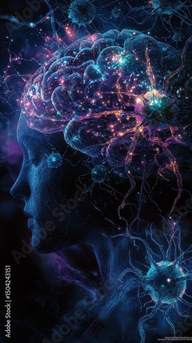 scientific, abstract, futuristic, colourful, nerve, art, structure, design, nerve cell, medicals, modern, complex, head, style, detail, light, digital, technology, illustration, glowing, graphic, brain, background, dark, system, space, glow, cell, human, network, vibrant, anatomy, intricate, nervous, image