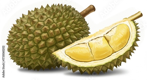 durian, fruit, illustration, food, tropical, exotic, spiky, green, yellow, creamy, fresh, ripe, whole, cut, isolated, white background, shadow, detail, closeup, texture, healthy, delicious, sweet, aroma, southeast asia, agriculture, produce, botanical, art, drawing, digital artwork, graphic, design, edible, nature, organic, epicure, cookery, dessert, snack, vegetarian, vegan, plant, seed, peel, spike, thorny