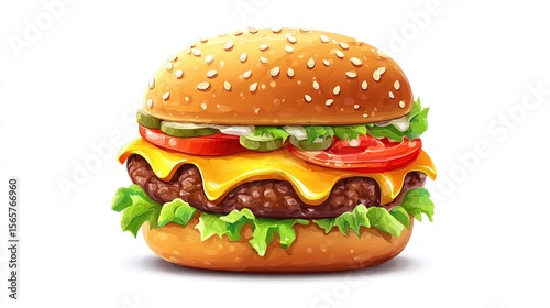 burger, cheeseburger, food, fast food, hamburger, sandwich, delicious, tasty, juicy, meat, cheese, bun, sesame, seed, lettuce, tomatoes, pickle, condiment, yellow, brown, realistic, illustration, graphic, design, digital, artwork, isolated, white, background, horizontal, comfort, classic, american, fast food, snack, lunch, dinner, protein, carb, healthy, unhealthy, deliciously, savoury, favor, appetence, ravenous, fast