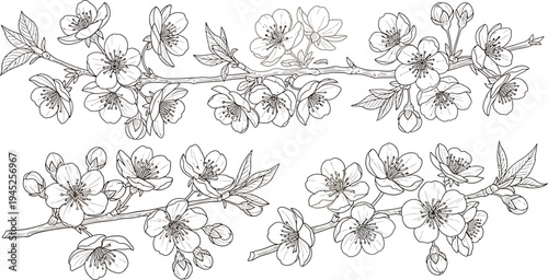 Detailed Line Art of Cherry Blossom Branches with Delicate Flowers and Buds