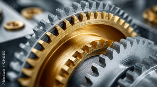 Detailed macro view of interconnected silver and gold metal gears illustrating mechanical precision and engineering concepts in industrial machinery systems