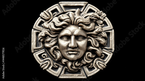 lion, sculpture, metallic, intricate, design, strength, power, art, decoration, wall, relief, face, expression, craftsmanship, detail, ornate, circular, home, interior, classic, vintage, artistic, emblem, symbol, heritage, culture, bold, striking, unique, decorative, artistry, mythology, ancient, regal, fierce, powerful, ornamental, medallion, detailed, home decor, interior design, timeless