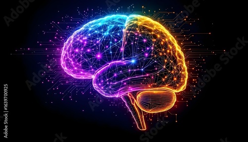 Detailed neon brain anatomy side view with colorful neural pathways and cerebellum on black background concept of neurodiversity and cognitive mapping