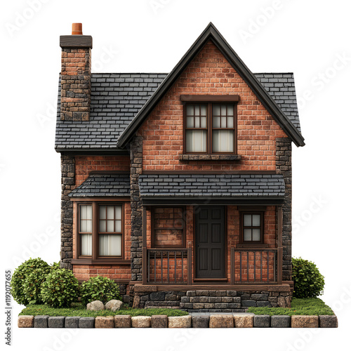 Detailed Realistic Model of a Brick House with Stone Accents on Transparent Background for Design Use