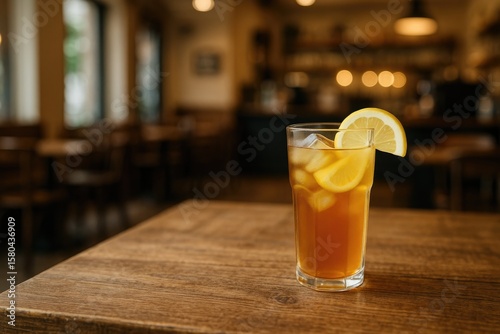 Detailed shot of an antique wooden table at a cozy coffee shop featuring homemade lemon iced tea and lemonade, with a softly blurred cafe setting in the background.