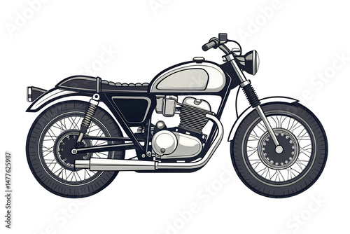 motorcycle, bike, vehicle, transport, transportation, engine, wheel, tire, seat, handlebar, headlamp, classic, vintage, retro, design, illustration, drawing, art, style, chrome, silver, black, outline, side, view, detail, speed, power, travel, ride, road, adventure, lifestyle, hobby, passion, gear, technology, machine, metal, steel, exhaust, cylinder, piston, fuel, tank, frame, suspension, spoke, rim