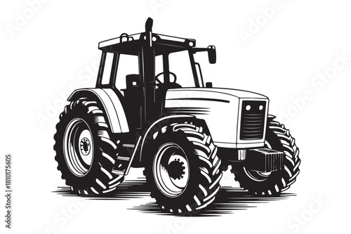 tractor, farm, equipment, agriculture, vignetting, drawing, illustration, vehicle, machinery, farming, rural, countryside, field, work, heavy, duty, industrial, transportation, power, engine, wheel, tire, cab, grille, black, and, white, monochrome, line, art