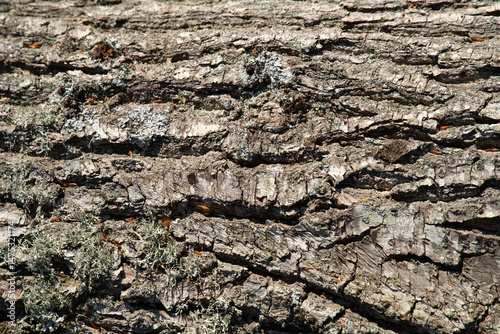 Detailed texture of tree bark showing lichens and natural patterns found in a forest setting during a sunny day
