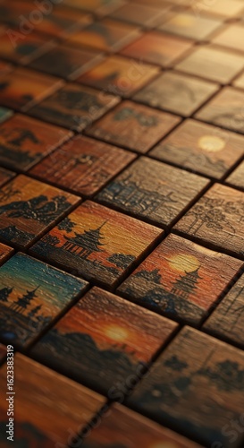 Detailed view of a collection of wooden tiles featuring unique sunset landscapes and traditional oriental art designs