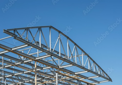 Detailed view of structural framing rising against a clear sky, showing modern building techniques and careful construction work, safety, site, career path