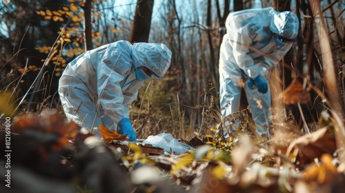 Detectives collecting evidence in a crime scene. Forensic specialists making expertise. Police officers and investigation in forest. Ai-generated.