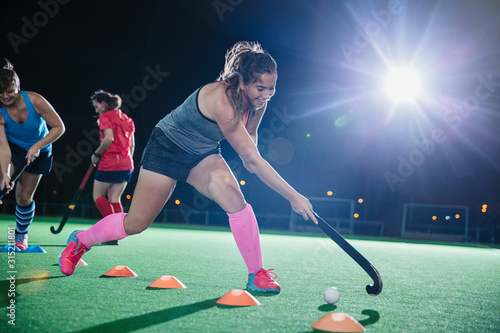 Determined young female field hockey player practicing sports drill on field at night