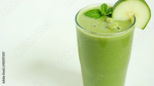 detox smoothie in a glass, featuring a blend of green ingredients like kale, cucumber, and green apple, garnished with a slice of cucumber and a sprig of mint, vibrant green color