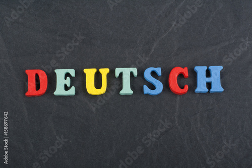 DEUTSCH word on black board background composed from colorful abc alphabet block wooden letters, copy space for ad text. Learning english concept.