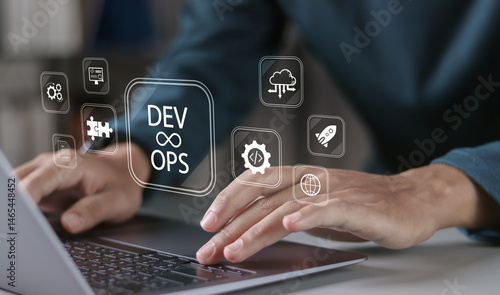 DevOps software development concept. IT operations, high software quality and software development. Person use laptop with DevOps icons on virtual screen for agile programming development.
