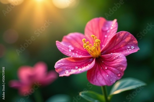 Dew-kissed flower petals shimmer in the morning light, hues, light, distance