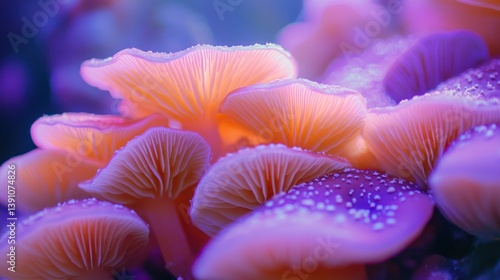 Dew-kissed pink mushrooms cluster, forest floor, glowing background, nature photography