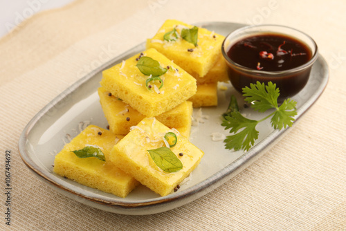 Dhokla, savoury sponge dish that is native to the Indian state of Gujarat and parts of adjacent states, and is popular throughout the country. It is made with a fermented batter that is steamed