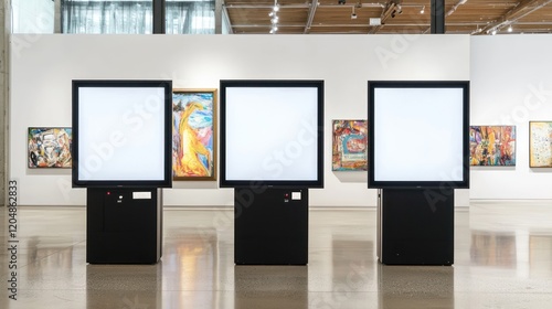 Diagonal arrangement of blank digital displays in a modern artistic space.