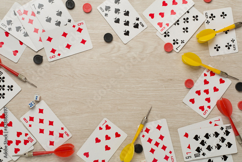 Different board games on wooden background, top view