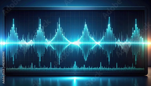 audio, wave, spectrum, oscilloscope, digital, signal, blue, teal, light, screen, graphic, datum, technology, electronic, display, analysis, sound, visualisation, information, interface, tech, modern, design, abstract, pattern, bright, dark, background, illustration