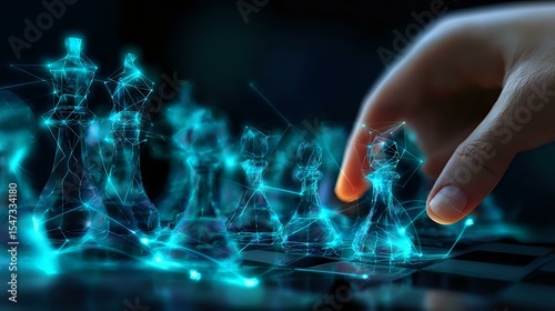 chess, strategy, artificial intelligence, ai, technology, innovation, leadership, planning, game, competition, success, neon, blue light, glowing, futuristic, digital artwork, network, connection, intelligence, gaming, board game, chess piece, hand, chessboard, dark background, light effect