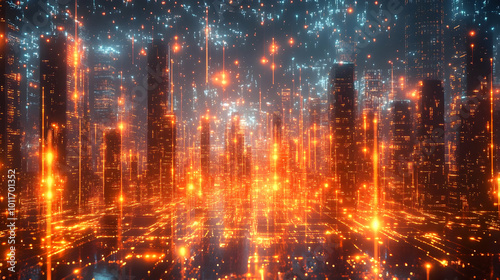 Digital Cityscape: Futuristic 3D Illustration with Orange Neon Lights