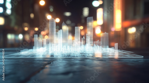 Digital Cityscape Hologram on Night City Background