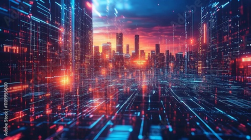 city, city landscape, digital, futuristic, sunset, neon, light, glow, network, technology, datum, information, code, binary, line, grid, abstract, architecture, building, skyscraper, urban, modern, scene, background, illustration, graphic, design, vibrant, colours, red, orange, blue, night, sky, horizon, perspective, view, energy, power, connection, communication, innovation, future, progress
