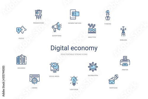 digital economy concept 14 colorful outline icons. 2 color blue stroke icons
