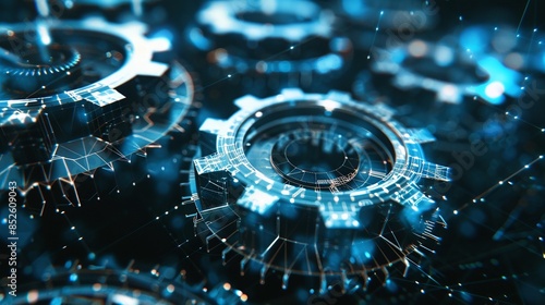 Digital futuristic gears rotation wireframe technology. AI generated image