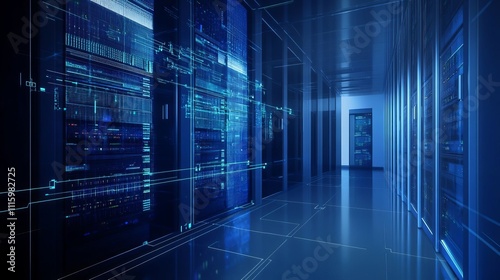 Digital hologram of server room with data flow, the background is dark blue and white, data flowing between the equipment in a glass cube.