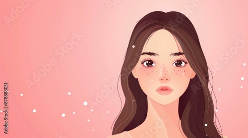 Digital illustration of a young woman with long brown hair on a pink background, displaying a calm and dreamy expression.