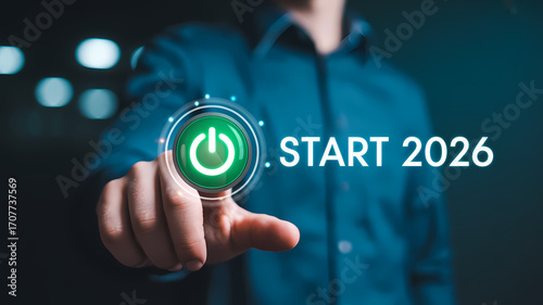 Digital Illustration of Hand Reaching to Press Green Power Button with START 2026 Text in Teal Modern Technology Interface