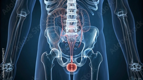Digital illustration of pelvic girdle in colour x-ray background 3D illustration of Human Urinary System Anatomy