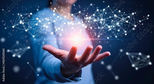 Digital Innovation: A person's hand reaches towards a luminous network of interconnected data points, representing the essence of digital innovation, futuristic technology.