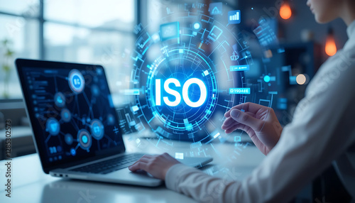 Digital ISO certification and compliance management, Business professional managing ISO certification and compliance using digital tools, focusing on quality assurance and documentation processes