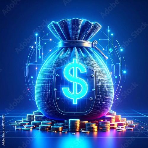 money, bag, digital, technology, finance, wealth, electronic, coin, glow, bright, future, three-dimensional, graphic, illustration, abstract, currency, light, neon, design, concept, innovation, modern, futuristic, pile, stack, system, tech